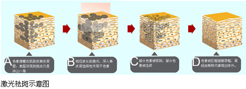 激光的穿透性可以使激光穿透肌肤表层,所以当激光作用到治疗部位时,可以深层穿透肌肤直达患处。光热效应可以使吸收激光能量的色素颗粒升温,并在光机械效应的配合下,产生光爆破效果,将色素颗粒爆破的更加细碎,然后通过表皮层和代谢系统排出体外,达到淡化色斑的效果。